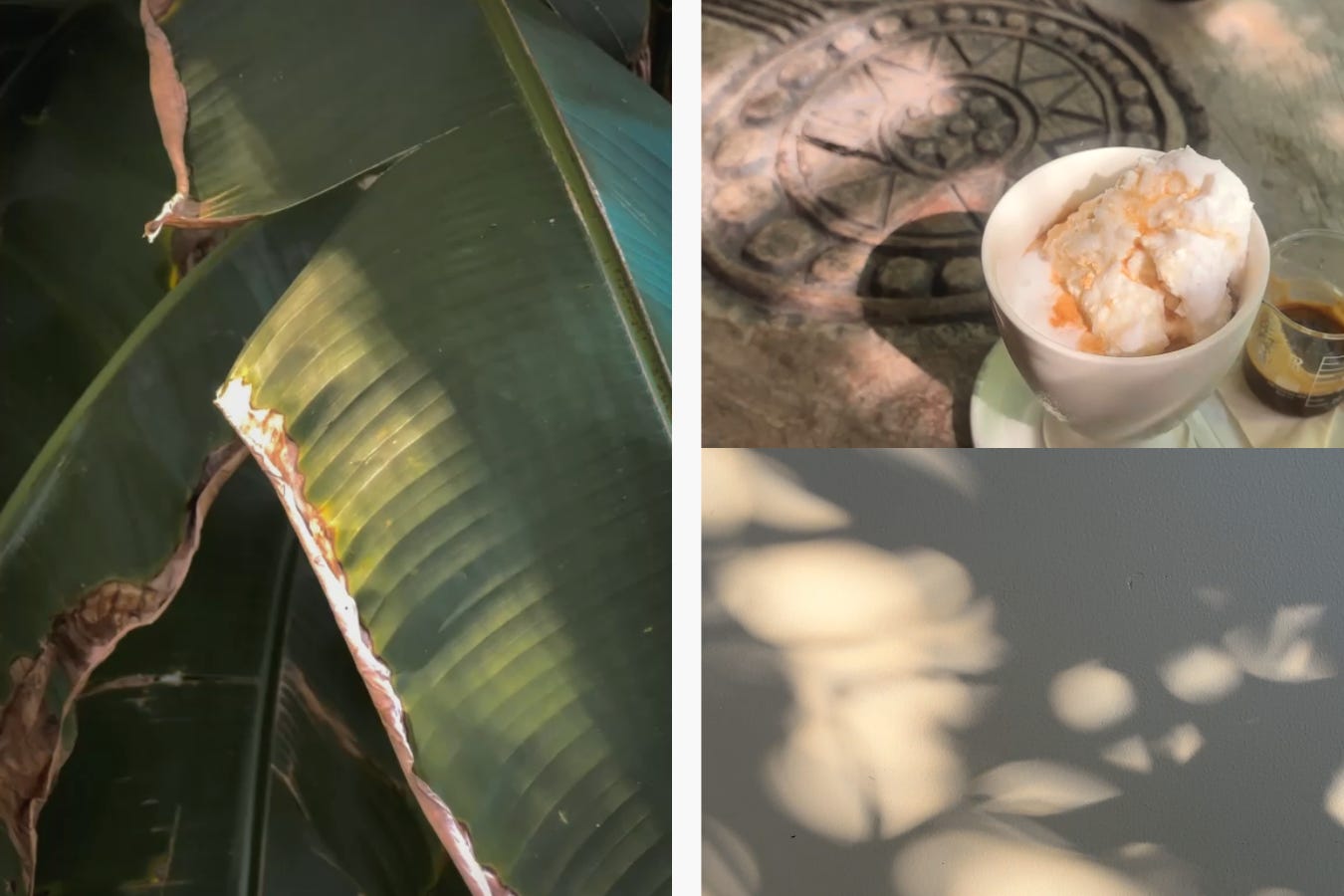 As an antidote to the rush, to the black-hole-like gravity of my work, I started watching the light. How it falls on different surfaces at various hours of the day; how it is filtered through leaves and bamboo roofs, dancing on top of tables, brick walls, the back of chairs. How it is both taken and given back by the water fogging up my glass and flowing lazily to my side.